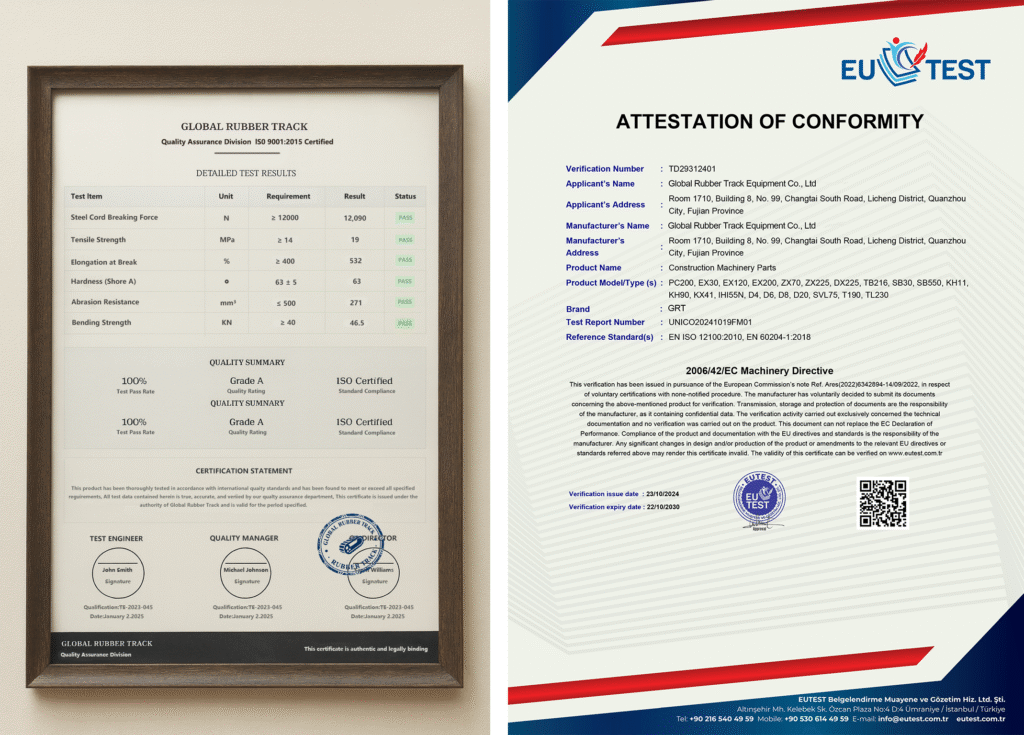 Our tracks are produced using full-automatic vulcanization equipment. This process tightly bonds the rubber and steel cores, enhances molecular stability, and increases anti-peeling and anti-cracking performance. Overall lifespan improves by 20%–30%.
